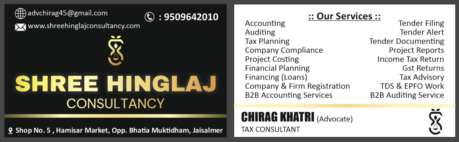 Established in Jodhpur, Rajasthan, Shree Hinglaj Consultancy stands as a trusted partner for businesses navigating the complexities of taxation, compliance, and growth strategies. Led by qualified professionals with BCom and LLB credentials, our team brings deep expertise in GST regulations, income tax planning, company compliance, project registration, tender filing, and business development—delivering precise results that drive sustainable success. ?We specialize in end-to-end support, from auditing and project reports to tender bidding and financial loans, ensuring clients in Rajasthan and beyond receive efficient, customized guidance rooted in years of practical experience. Our commitment to excellence is reflected in every service, helping enterprises like yours achieve operational efficiency and regulatory peace of mind. ??